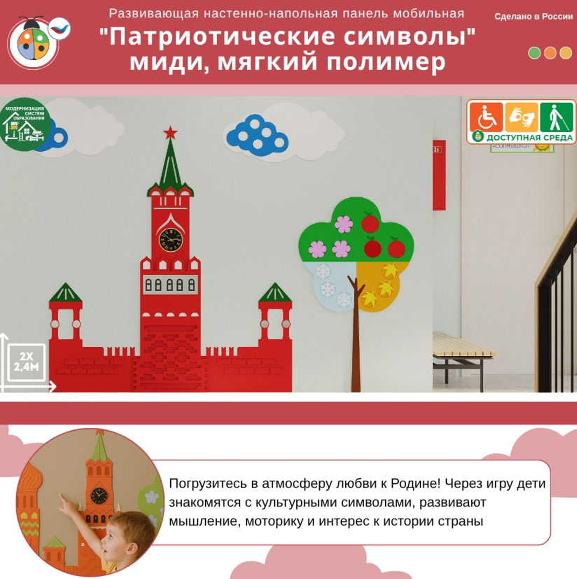 Панель выполнена в патриотической тематике и включает в себя съемные элементы, магнитные детали и пальчиковый лабиринт. Яркие цвета и разнообразие текстур привлекают внимание ребенка и способствуют познавательному развитию.
