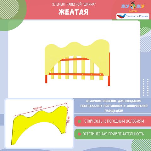 Элемент навесной "Ширма" желтая, для желтого ограждения — это отличное решение для декора, зонирования площадки, проведения театральных представлений. Такая ширма сочетает в себе прочность, устойчивость к погодным условиям и эстетическую привлекательность.