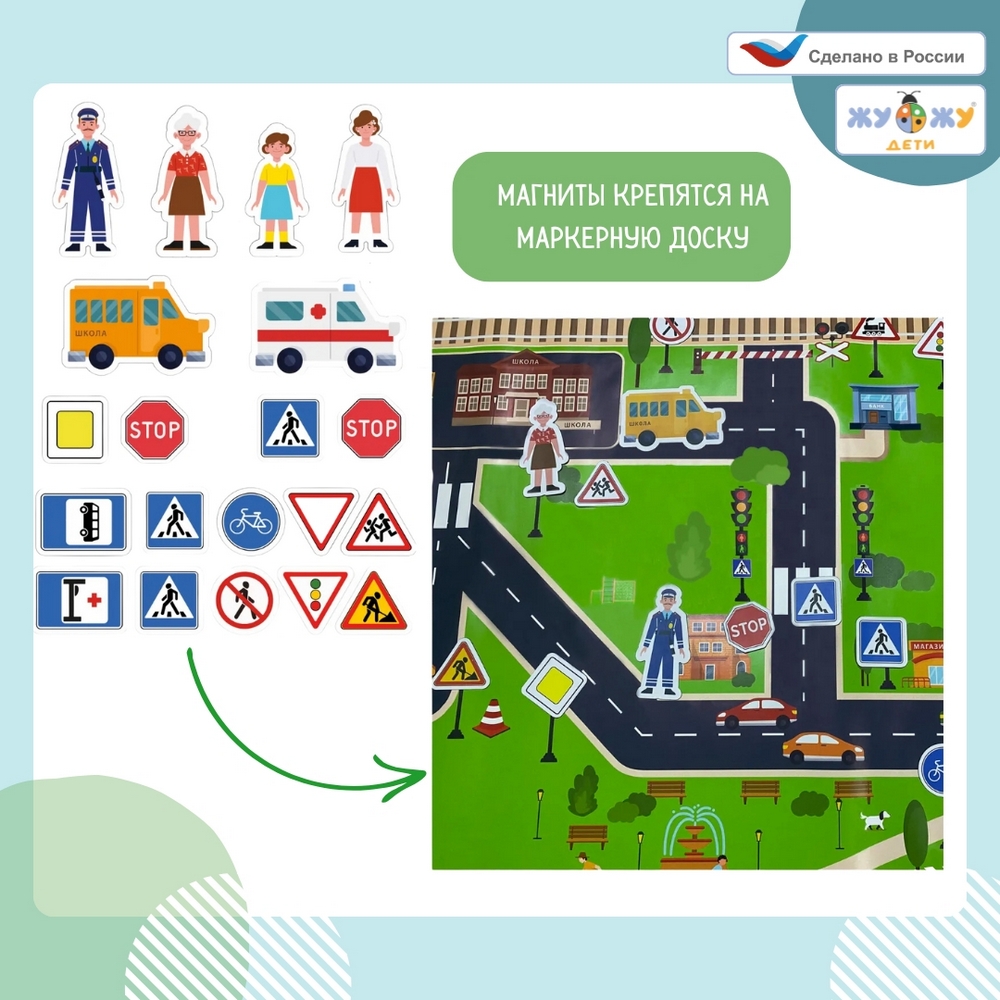 Доска представляет собой игру с комплектом магнитных знаков дорожного движения, 2 фигурками людей, 2 фигурками машинок.