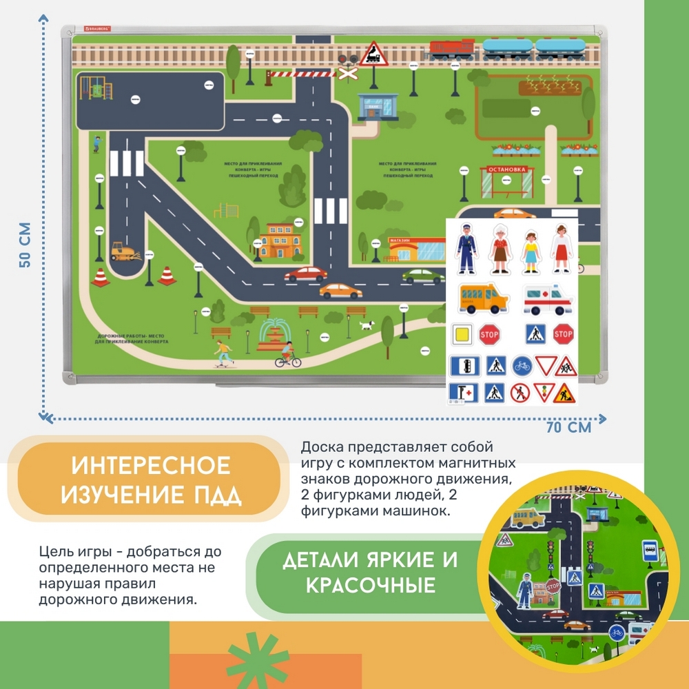 Доска представляет собой игру с комплектом магнитных знаков дорожного движения, 2 фигурками людей, 2 фигурками машинок. Цель игры - добраться до определенного места не нарушая правил дорожного движения. Обучайте детей ПДД в игровой форме с большой и яркой магнитно-маркерной доской "Безопасный маршрут школьника"!