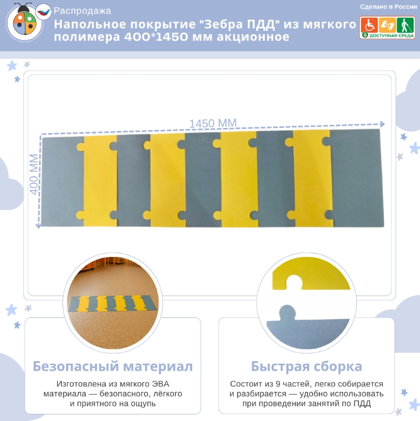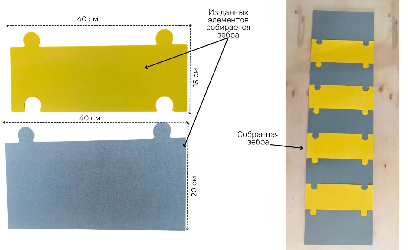 - Размер собранной зебры (Длина х Ширина х Толщина): 1450х400х5 мм.