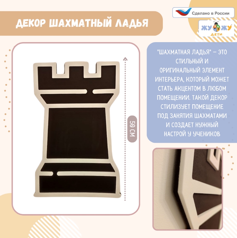 Декор "Шахматная ладья" — это стильный и оригинальный элемент интерьера, который может стать акцентом в любом помещении. Такой декор не только украшает пространство, но и добавляет ему интеллектуальную и художественную атмосферу.