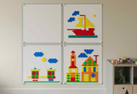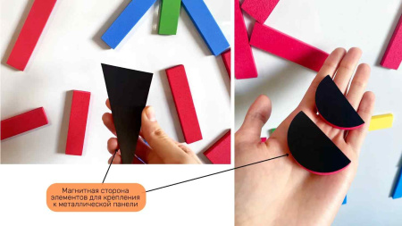 Комплект мозаики состоит из 300 шт. геометрических фигур: треугольники, прямоугольники и полукруги (5 вариантов цвета). Устанавливайте фигуры с магнитами на металлические панели. Конечная фигура зависит только от фантазии игроков!