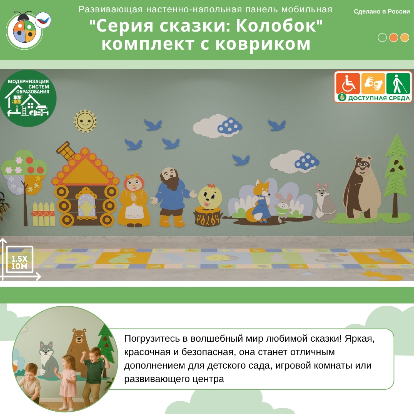 Яркая и красочная настенная панель "Колобок" – идеальное решение для зонирования пространства и оформления групп в детских дошкольных учреждениях. Этот замечательный элемент декора поможет познакомить детей с русскими сказками и украсить помещение. Яркие образы героев сказки "Колобок" привлекают внимание и вызывают интерес у малышей.