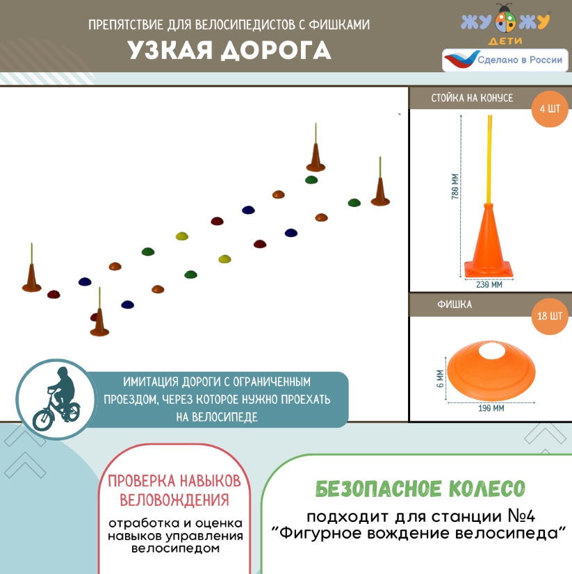 Препятствие для велосипедистов "Узкая дорога", набор фишек предназначено для детского конкурса "Безопасное колесо" станции №4. Представляет собой дорожку, выложенную фишками в два ряда, окончание дорожки отмечается стойками на конуса.